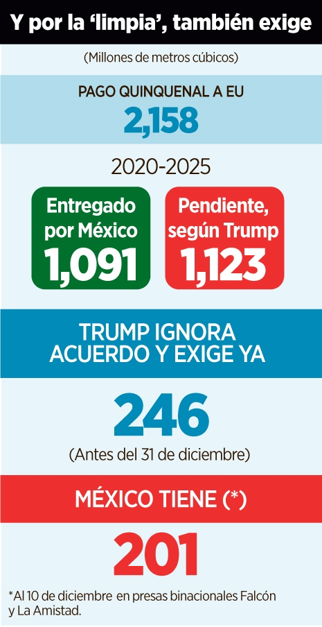 El lunes, Trump exigió entregar 246 millones de metros cúbicos de agua de la cuenca del Río Bravo a agricultores de Texas antes de que termine el año. Sin embargo, el Tratado de Aguas de 1944 considera que, ante las sequías extremas, es posible pagar en el ciclo siguiente.
