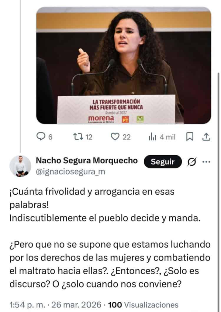 A través de redes sociales, Segura Morquecho sostuvo que la decisión limita el derecho ciudadano a elegir libremente y cuestionó su coherencia con la narrativa de igualdad de género impulsada por Morena.