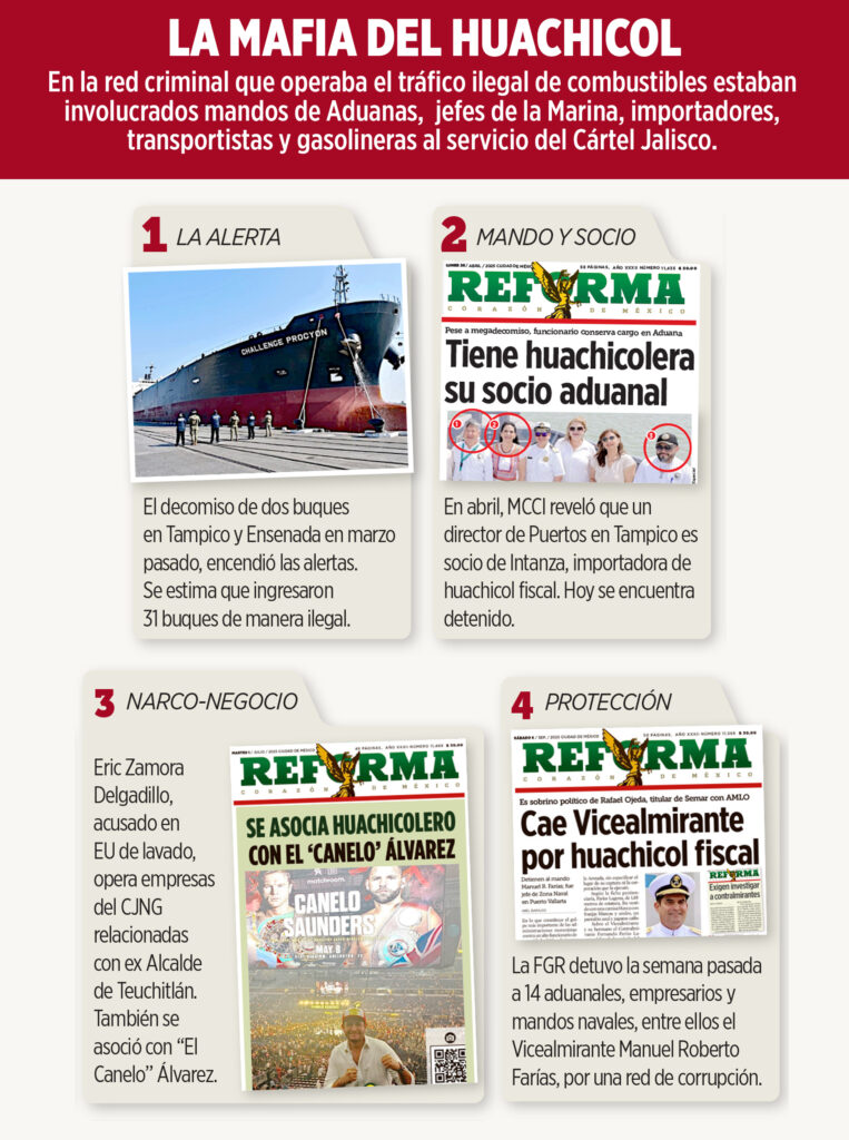 El Cartel Jalisco Nueva Generación (CJNG) tuvo bajo su control una intrincada red de complicidad entre marinos, funcionarios, agentes aduanales, exportadores e importadores, distribuidores y empresarios gasolineros.