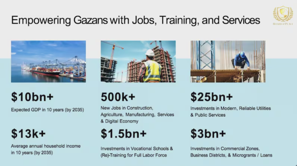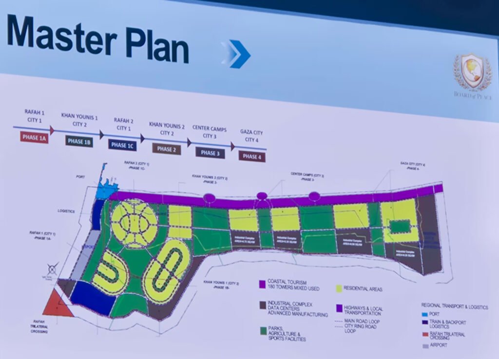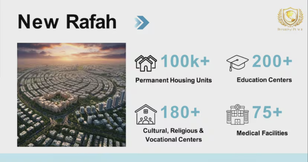 Kushner explicó que el plan de reconstrucción comenzaría en Rafah, la ciudad del sur prácticamente destruida, con la construcción de más de 100 mil unidades residenciales, y avanzaría gradualmente hacia Ciudad de Gaza. Sostuvo que en Oriente Próximo ya se han levantado ciudades para dos o tres millones de personas en apenas tres años, por lo que consideró viable el proyecto. “Gaza puede ser un nodo, un destino turístico, tener industria y convertirse en un lugar donde la gente prospere y genere empleo”, afirmó.