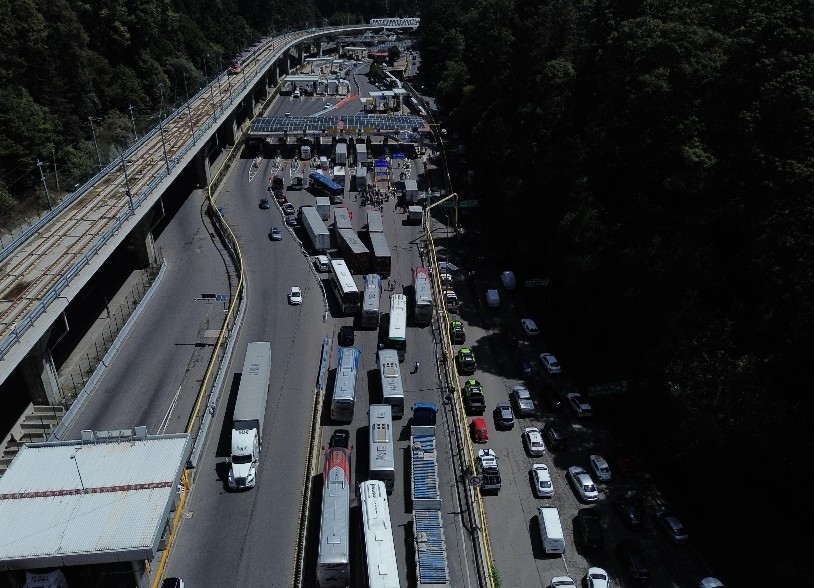 En la caseta de La Venta, en la Carretera México-Toluca,transportistas levantaron las plumas, pero los vehículos no pueden pasar porque autoridades activaron los poncha llantas.