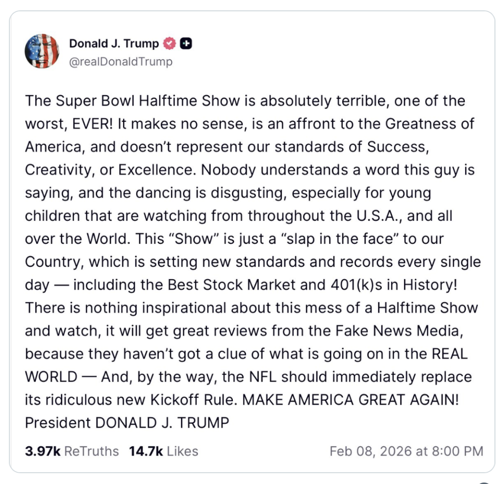 «Este ‘show’ es solo una «bofetada en la cara» para nuestro país, que está estableciendo nuevos estándares y récords todos los días (…) No hay nada inspirador en este desastre de show de medio tiempo y, obsérvenlo, recibirá excelentes críticas de los medios de noticias falsas, porque no tienen la menor idea de lo que está pasando en el mundo REAL», indicó Trump.