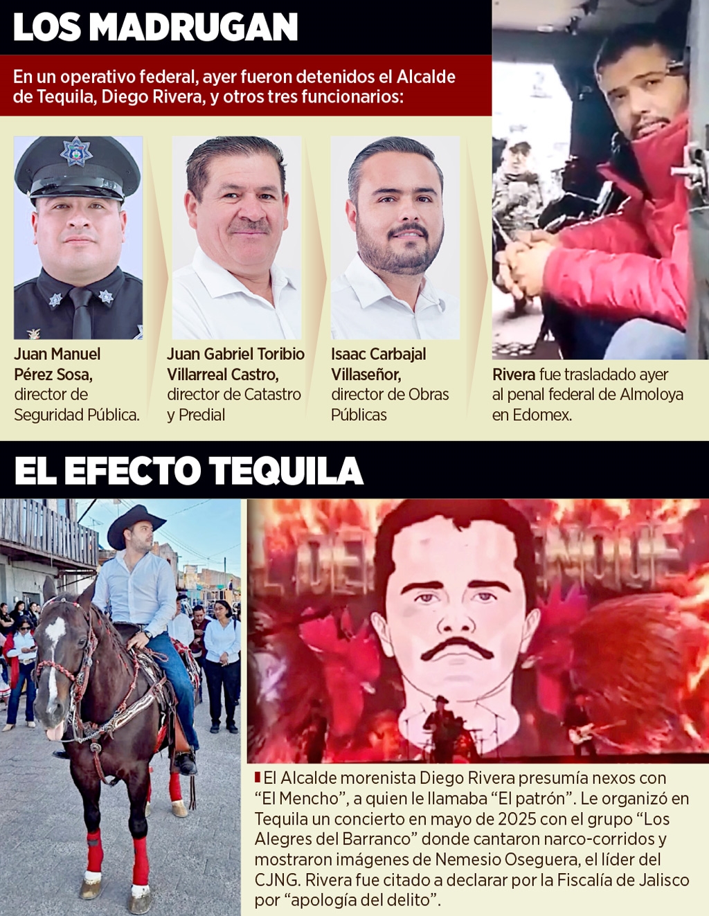 Además de Rivera, fueron capturados ayer Juan Manuel Pérez Sosa, director de Seguridad Pública; Juan Gabriel Toribio Villarreal, director de Catastro y Predial de Tequila. En flagrancia, fue detenido Isaac Carbajal Villaseñor, Director de Obras.