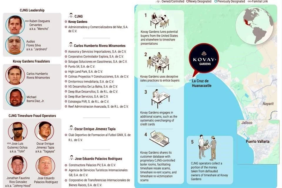«Este modelo de fraude de tiempo compartido, integrado verticalmente, permite al CJNG victimizar de forma eficiente y reiterada a los propietarios de tiempo compartido de Kovay Gardens, quienes a menudo son ciudadanos estadounidenses», dijo el Tesoro.